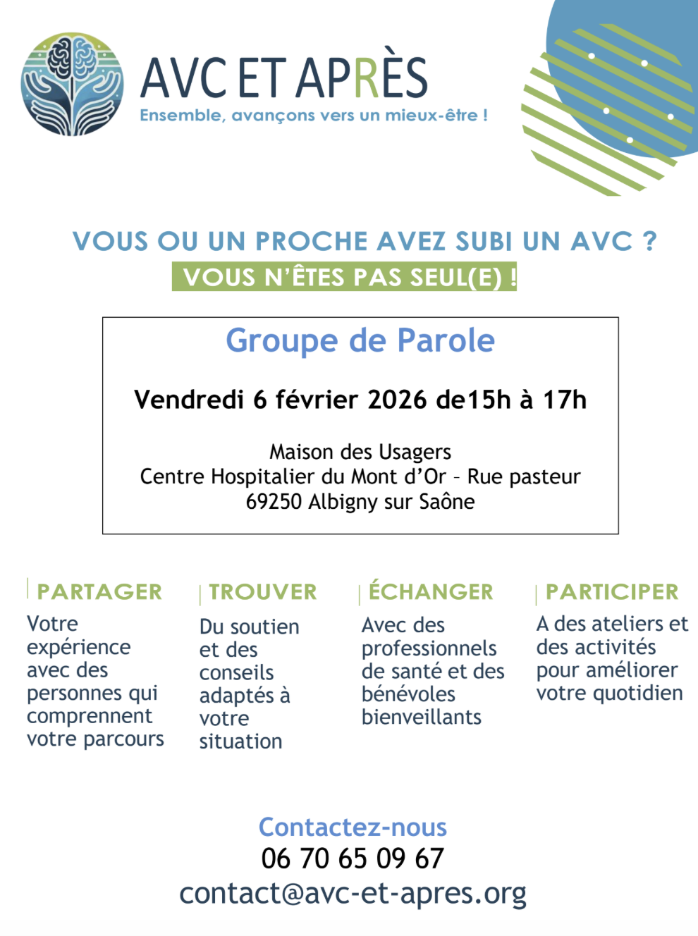 L'association AVC et après propose un groupe de parole dédié aux personnes ayant subi un AVC ainsi qu'à leurs proches.